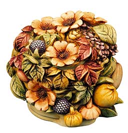 This autumnal bouquet features an interior Lord Byron busy at work carving a pumpkin. Each piece is hand-numbered and initialed with MRP. Hallmarks include ©, star, HBC logo, and M.