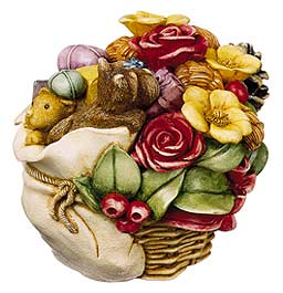 A terrier pokes his head out of a Santa’s bag laden with gifts. The plentiful presents spill over into a basket full of flowers. Red Christmas roses and silver and gilt pinecones contrast with the shiny green of holly leaves. Inside the compartment, Lord Byron and the Beetle brothers sled down a snowy hill on home made toboggans. Byron calls out to one of the brothers who is heading dangerously for a tree. Or his he showing off his yodelling skill, acquired during his European travels? |