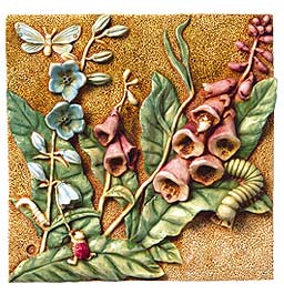 The blossoms on the left of this tile figurine belong to a campanula plant, named for its resemblance to bells. Lord Byron has taken this to its logical conclusion, pulling down on a bell rope. To his right and above him are foxglove blooms. A little bug with Rip van Winkle hat uses one as a sleeping bag. Is Byron trying to awaken him or disrupt the studious centipede learning his A B C's? |