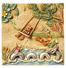 In the foreground of this tile figurine, a fishing bug worries about his catch. The lake monster isn't too pleased either. A donkey mischievously bites the tail of a cat from behind a hedge grove, while a mouse looks on with relieved astonishment. Oblivious to this mayhem, a couple of squirrels enjoy the romance of the garden, while a lone rabbit wistfully looks on. |