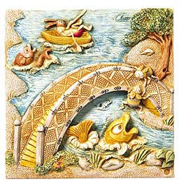 The lake from "Swing Time" cascades over this tile figurine, and it appears that the waters haven't calmed. Top left, a water boatman rows for his life at the sign of a shark fin, unaware of the hungry fish behind him. An orante Chinese bridge frames the center, but even here there's drama as a bee attempts to rescue his friend from the open-mouthed carp. Is Lord Byron inside his chrysanthemum plant-a-tarium, at the foot of the bridge? |