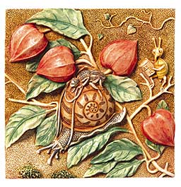 Amidst the beautiful magic lantern flowers on this tile figurine we see a beetle jockey, taking out his prized thoroughbred snail for a run. A rival trainer attempts to spoil the day's training session by spreading "Saxo" salt on the snail's tail. Notice the chevrons on the salt container. Try to guess what this has in common with cooking salt? |