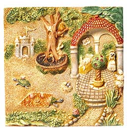 Pastoral picnicking is the central theme of this tile figurine, but two tortoises disrupt the tranquility. One can be seen carrying off cup and saucer on his back. Notice "Eat Me" atop the cake, a reference to the Mad Hatter's tea party. In the gazebo, a woman with binoculars mysteriously stares outwards, while to her left, Martin Perry's dog Alfie dreams of lunch. Alfie surely has a palatial kennel. His residence at top left comes replete with TV aerial, bone and bowl. Another flower from Byron's home garden appears in the foreground. |