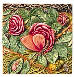 A beautiful butterfly sits centre stage atop a rose in this more civilised tile figurine. Around her wander creatures of the hedge - a nut weevil named "P-Nut," a little maggot, a bug wearing a bowler hat, a tadpole, a tiny aphid, and a small worm. Yet this tile isn't without a bit of mischief. Notice the spider's expression at bottom left, directed toward the weevil in "Cata's Pillow." |