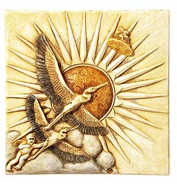 At bottom left on this tile figurine is a cherub wearing dark shades, aiming his catapult at one of the storks. The UFO at top right has the word "Foo" inscribed on its underside. This is short for "Foo Fighters," enigmatic flying objects sighted during World War II. Rufus reappears, this time holding on for dear life atop the UFO. |