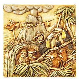 Against a backdrop of a raging volcano, Mrs. Noah is resigned to doing the washing. She has a lot to do now that her sons and the old man are off the ark. Below the palm trees, two toucans guzzle the drink associated with them - Guinness. Notice the pair of parrots, one of which is sporting a crutch like Long John Silver. The stars of this tile figurine are the two monkeys who are learning to play poker. One wears a croupier's peak and consults a how to manual while the other considers his hand. A wombat sits near the clothes pole waiting for a fish, but not if Rufus can get to it first. |