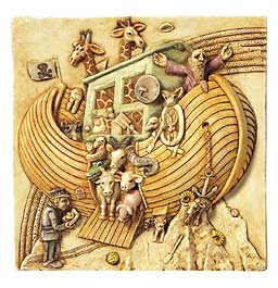 The flood has receded and Noah's ark has run aground. God, who causes a rainbow to appear as a sign of his covenant that such a flood won't occur again, blesses Noah. However, God makes no promise that Noah won't get a parking ticket. The animals, like children bursting through the entry gates of a theme park, run down the gangway, eager to find adventure on the tile figurines that make up "Noah's Park." Even Peter's signature mouse bursts through a tiny portal. |