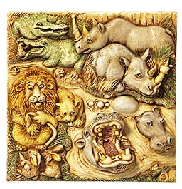 At bottom left on this tile figurine, a pair of rabbits can be seen holding up a lion at carrotpoint. One holds the loaded carrot in a menacing way while the other plugs her ears in anticipation of the bang. The lioness is distracted by a bad smell bubbling up from the river beside her. This has emanted from the hippo, whose mate, with mouth wide open, enjoys some dental work courtesy of a NHS flying doctor. On the riverbank in front of him is a pair of eyes. We don't know what they belong to, but follow them out into the water and they meet a set of nostrils. Notice the rhino spearing an apple with BG on her tusk. Could this have something to do with Bill Gates and Apple Computers? The other rhino has some incriminating rubber wear in a prominent place. We then come to the crocodiles at top left. Rufus is prizing apart the jaws of one of the crocs, an attempt to rescue his eaten friend. A fish pokes his head out in amazement at Rufus's strength. |