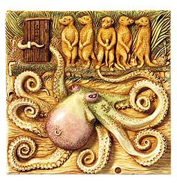 The octopus dominates this tile figurine, but look closely. He's into body piercing and has a tattoo done in the best navel tradition. On one of his tentacles he wears a diver's watch by which he can time his attacks on the meerkats waiting for the loo. At the back of the queue, a female meerkat flirts with one of the lads, showing off her designer handbag. His compadre standing alongside is unimpressed. He's wielding a stick to pin down the tentacle before it whisks him away. The two nearest the loo have the call of nature to fight off. This is going to be difficult as the doorway is barred with another of the tentacles slipped into the door handle. Notice where the outflow pipe leads. |