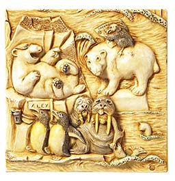 Mad Murphy holds a stein of lager on this tile figurine, while his penguin companion holds a sign reading "Alex," an homage to the old black and white war movie, "Ice Cold in Alex." To their right is a walrus with bandaged tusk that looks down in the mouth. The other has successfully caught a fish, whose mate is trying to pull him back into the water. Above the incongruous U-boat periscope sits a polar bear atop an ice flow, reminiscent of the pose struck in Fox's Mint advertisements. On her back sits a dodo that can't find his way back to his partner in "Mark of the Beast." He reads the London Undergroun in an attempt to find her. The bear on the left with wrap-around shades laughs at the expense of his pal who has a bird dropping on her back. |
