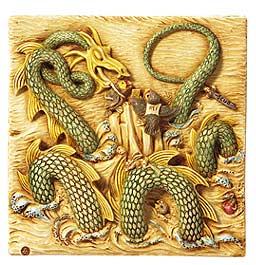 The central theme on this tile figurine is a group of puffins being tormented by an angry sea serpent. Peter's signature mouse has scurried from "The Lost Ark" and floats atop a tin can in an attempted rescue. One puffin, having just finished his stint as referee for the World Cup, waves a card at the serpent as punishment for having upset his friend's evening. The tip of the serpent's tale has been transformed into a barbed Scud missile. And finally, Rufus makes another appearance, riding bareback on the serpent. He's wearing a snorkel mask and flippers, and if you look closely, he has a dagger strapped to his thigh. |