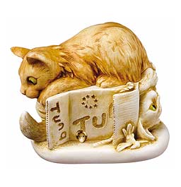 Two kittens frolic in a large cardboard box, better than any expensive cat toy! Maybe it’s the faint scent of tuna lingering on the old box that has attracted the frisky felines. Inscribed on the box lid is the phrase “River Severn Tuna.” The River Severn is a former favourite fishing spot of Peter’s, and about the unlikeliest place on earth you’d ever find a tuna. A dead bird with its feet in the air reminds us that although cats are loveable and cuddly creatures, they have predatory instincts as well. The kittens on Version 1 and Version Infinity are different colours (grey in Version 1 and orange in Version Infinity). In addition, Version 1 features an extra mouse peeping out of a hole chewed in the side of the box. A name change occurred as well between the two versions. Version 1 is named "Tony's Tabbies II" and Version Infinity "Cannery Row." |