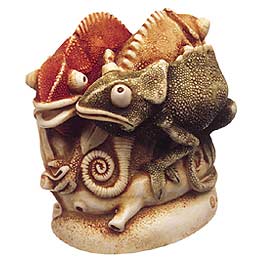 A favourite of Peter’s because of its challenging texture, this box figurine depicts three scaly chameleons, each bearing an inscription: “USA,” “HK,” “PC,” and “KAY” (Antiquark’s General Manager) hidden in reptile scales. The inside of this piece reveals a little snail but was initially empty. Hallmarks include diamond, clock face with month 4, HBC logo, and Pc. |