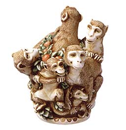 An expressive family of monkeys is the theme for this box figurine. The interior contains the head of Yorrick, Hamlet’s one time jester and friend. Unscrew the head to reveal a book inscribed with “Alas Poor Lucy.” Colour variations on the berries can be found, ranging from red to orange to yellow. Each piece is hand-numbered, bears the artist’s monogram and is accompanied by a certificate of authenticity. Hallmarks include ©, heart, HBC logo, ed.#, and DL. |