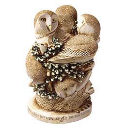 Distinguished owls decorate this box figurine. Along the base is the inscription, “If the oak’s before the ash you’ll only get a splash” and the score, “Charles 2 NOL 0.” Inside is mistletoe with the words “Kiss Kiss.” Each piece is hand-numbered, bears the artist’s monogram and is accompanied by a certificate of authenticity. Hallmarks include ©, heart, HBC logo, ed.#, and DL. |