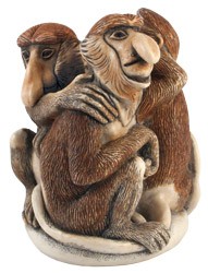 While Master Carver Peter Calvesbert has never seen a Proboscis Monkey (after all, they are only found on the island of Borneo), he had little difficulty capturing its essence, due to its prominent feature - a large, fleshy nose that droops downward over its chin. But its second most noticeable trait – its brightly colored genitalia – posed a bit of a dilemma. The interior of this box figurine shows a “handsome” big nosed man holding a sign that says “Big noses are sexy”.