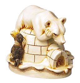 At the time of the creation of “Murphy’s Last Stand,” Peter had actually created two rough polar bear box figurines. “When Nature Calls” was put on the back burner as he preferred to develop “Murphy’s Last Stand.” In 1998, Peter took another look at the embryonic “When Nature Calls” and felt inspired to continue with its creation. Here, the Polar Bear is in a happier frame of mind as he patiently waits for the occupant of the igloo to come out of the ice tunnel. Little does the polar bear realise that the English explorer, having sensed the danger outside, is creating another escape route by removing an ice brick. Murphy and friend, in exile at the North Pole, are ready to aid and abet the man's escape. But who will help Peter's mouse? The seal is not happy to have had his breathing hole built over and is checking out the igloo for food pickings. Murphy has left his mark leaving his name in “Yellow Snow.” Version 1 has a man starting to peek out the back of the igloo; his head appearing in Version Infinity. Hallmarks include ©, star, HBC logo, ed.#, and Pc. |