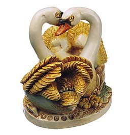 David says that the inspiration for this first Romance Annual was the enduring nature of love, as swans pair for life. The plumage on each swan lifts up to reveal two hidden compartments, one containing a rose in tribute to Princess Diana, and the other containing a pillow that may be removed to reveal a red heart. David’s acorn is between the leaves on the base. The first 3,660 have swans with red beaks and blue pillows, the next 404 have yellow beaks and blue pillows, and the rest of the edition has yellow beaks and light green pillows. Hallmarks include ©, heart, HBC logo, ed.#, and DL. |