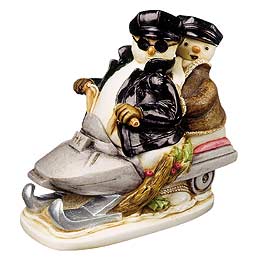 Sid the snowman has finally coaxed his girl Nancy to take a ride on his snowmobile. At first a tad apprehensive about the noisy machine, Nancy has discovered the joys of cruising in comfort: fresh air, beautiful scenery breezing by, and snuggling close to Sid. Sid quite possibly may be paying more attention to Nancy than to the road: a festive holly bush, unfortunate enough to be in the way, has been run over by the snowmobile. Within Version 1, Mad Murphy glides downhill on a makeshift sled of cardboard. Inside Version Infinity Wolfie, hatless and mittenless, curls up under his tail to keep warm. |