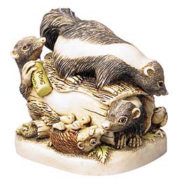 Three skunks guard their “olFactory,” armed with a canister of air freshener. Their neighbour, the rabbit, has donned his daily apparel: a gas mask. The unfortunate porcupine with his low tech defense (a clothes peg), has succumbed to the awful stench. Even the snake has failed to slither away in time. Peter’s mouse must be holding his breath. And why the Australian skink? Well, he thought he was going to star in a Harmony Kingdom box figurine and is appalled and embarrassed at his error. How could he confuse “skink” with “skunk?” Is Australian English so different from American English or British English? “I love Plum” is a reference to a military store on an island off the East Coast of the United States. Inside Edition 1 there is a young skunk reading from a recipe book and mixing ingredients for the skunk pong in a cauldron. The inscription around the cauldron refers to the official term for the skunk's smelly fluid, “mercaptan.” Scattered around the pot are two tins of baked beans (57 variety), salt and pepper, a bat wing, eyeballs, fish and more secret ingredients. The Infinity Version has old sneakers. Hallmarks include ©, star, HBC logo, ed.#, and Pc. |
