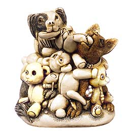 This box figurine stars two Harmony Kingdom dogs: the Perry's Alfie and Peter's Murphy. It represents the fantasy world of these fast friends who meet every Wednesday at Wimberley Mills and wreak havoc as they dash around the studio fighting over balls, sticks and toys. Murphy cannot be left alone with soft toys. It is, after all, a dog's natural instinct to tear up small furry things! Possibly that's why Peter's mouse has found a secure hiding spot. This piece does contain some disturbing images and should only be viewed by a “mature” audience. One teddy has a knife in its back and another is smoking. Up until March 1999 the name of this piece was “Perished Teddies.” It was changed due to its similarity to another collectible. Inside Version 1 is a beheaded doll looking vaguely familiar. The Infinity Version portrays Peter lying amidst torn up teddy bears. Hallmarks include ©, star, HBC logo, ed.#, and Pc. |