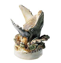 Peter’s first close up sighting of whales was on a visit to Cape Cod in June 1996 with the Perry family after the Rosemont International Collectibles Exhibition. Some pieces include the mouse on the whale’s left fin; others have no mouse. Within this box figurine is the HBC logo, a mermaid’s tail disappearing into the depths, and a fish jumping the waves. “Deep Blue” is inscribed in the lid, and “I hate Ninevah” faintly inscribed inside. Due to production difficulties, the base was redesigned to shorten the waves. Hallmarks include ©, heart, HBC logo, ed.#, and Pc. |