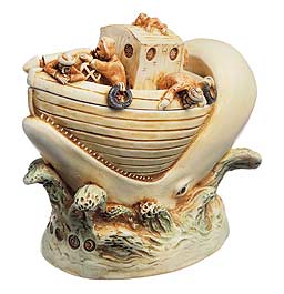 This box figurine features a whaling boat named “Cachalot” (French for sperm whale), and five fisherman (4 on board and 1 overboard). Inside Version 1 Jonah saws his way from the whale’s mouth into the hull of the boat. Inside Version 2 a swarm of tourist boats rush to get the first sighting of a whale. A third version in the Infinity Edition depicts a dog on the roof of the wheelhouse sporting a slicker to protect him from the rain. NCP stands for National Car Parks. The mouse is tucked inside a life preserver. Hallmarks include ©, star , HBC logo, ed.#, and Pc. |